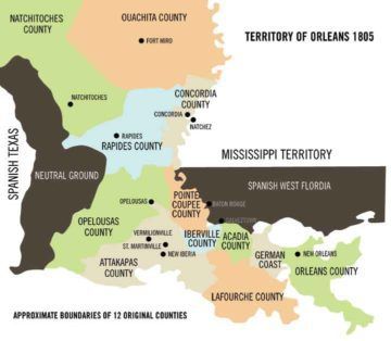 Territorial legislature meeting in New Orleans this week in 1804, voted to create twelve “counties” in Louisiana. They were: Orleans, Baton Rouge, Feliciana, St. Helena, St. Tammany, Natchitoches, Rapides, Ouachita, Concordia, Madison, Iberville, and Pointe Coupee. These entities would not be recognized as “parishes” until the new constitution of the State of Louisiana went into effect in 1812; and over the years, they would all be divided and re-divided into smaller parishes.