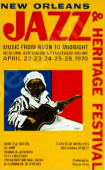 The first New Orleans Jazz and Heritage Festival, better known as Jazzfest, opened this week in 1970. The New Orleans Jazz & Heritage Foundation, a nonprofit organization, was established to oversee the Festival and hired George Wein, the father of the Newport Jazz Festival to design and produce a unique festival for New Orleans. Wein’s concept of the Louisiana Heritage Fair was a large daytime fair with multiple stages featuring a wide variety of indigenous music styles, food booths of Louisiana cuisine, and arts and crafts booths, along with an evening concert series. Mahalia Jackson, Duke Ellington, Pete Fountain, Al Hirt, Fats Domino and others would perform at the first festival.