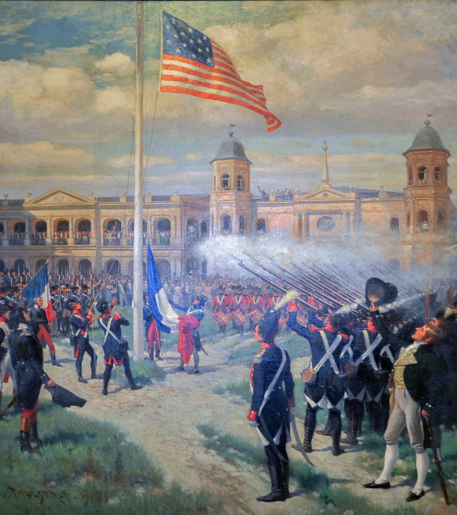 Today in 1803, nine years to the day before Louisiana became a state, the United States and France completed one of the largest land deals in history in Paris. The United States acquired 828,000 square miles of land for $15 million–that’s about four cents an acre. The deal, orchestrated by Robert Livingston and James Monroe, doubled the size of the U.S. and facilitated rapid westward expansion. It included territory stretching from the Mississippi River to the Rocky Mountains and makes up all or parts of 15 present-day U.S. states and two Canadian provinces. The formal transfer of ownership in what is now Jackson Square in the famous painting did not occur until December 1803.