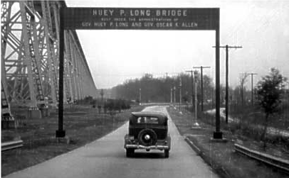 The Huey P. Long Bridge in Jefferson Parish, the first bridge over the Lower Mississippi River, was dedicated this week in 1935. Before the ceremonies, a special sixteen-car train stuffed with dignitaries left Union Station, crossed the bridge to Avondale and returned. Thousands packed the traffic circle on the New Orleans side of the bridge for the ceremony where Governor O. K. Allen spoke and Mrs. Rose Long cut the ribbon for the span named for her late husband. C Later in the afternoon, a second train left Union Station for those who wanted to cross the bridge on the first day. Construction work had formally started on December 31, 1932.