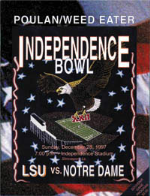 Tonight in 1997, the biggest crowd in Poulan Weedeater Independence Bowl history turned out at the Fairgrounds to watch LSU trounce Notre Dame, 27-9. The 22nd edition was the second time the teams had played each other that year, as the Irish had defeated the Tigers in Baton Rouge, 24-6, on November 15th. LSU’s Rondell Mealey and Arnold Mealey were named the outstanding players of the game. McNeese State defeated Tulsa in its first game in the first Independence Bowl in 1976, which was called the Bicentennial Bowl, before changing its name the following year. Over the years, LSU, Tulane, McNeese State and Louisiana Tech have played in the bowl.