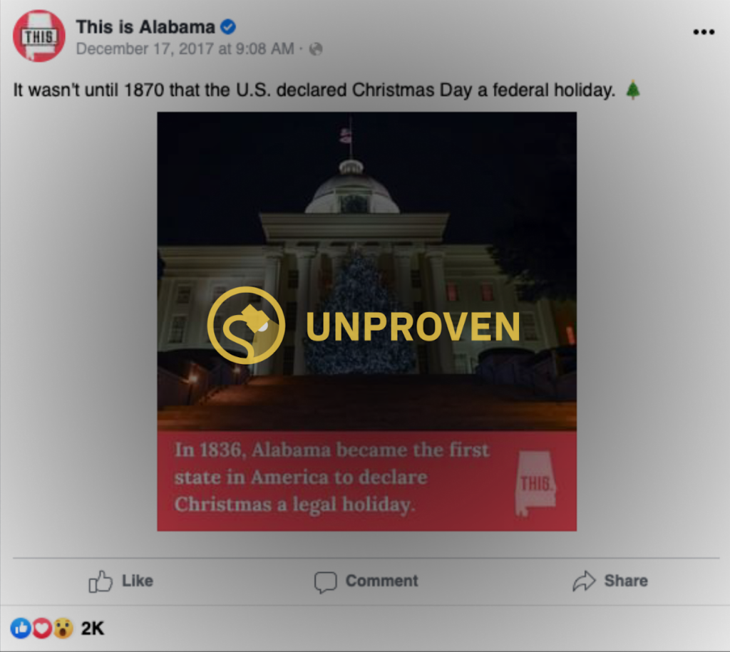 So if you’re just looking for something else to argue about with somebody from Alabama, tell them that Louisiana, not the Yellow Hammer State, was the first state to officially recognize Christmas Day in 1838. Alabamans will claim that it was recognized there in 1836; however, according to Snopes.com, four different directors of the Alabama State Archives have said that they can find nothing to back up the claim, which first started making the rounds in 1954. Claims by Louisiana and Arkansas to be first in 1838 are better substantiated. But in the spirit of Christmas, we should all agree that wherever it came from, it was a pretty great idea.