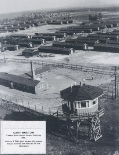 Camp Ruston in Lincoln Parish, one of four large internment facilities established in Louisiana to house the hundreds of thousands of captured Axis soldiers who were transported to the United States, was activated this week in 1942. After a survey of several candidate sites in north Louisiana, the War Department selected the Grambling location, in part, because of its proximity to the Vicksburg, Shreveport, and Pacific Railroad—a necessity for the efficient movement of men and materials. Officials bought 750 acres via eminent domain from the landowners for $24,200 and promised the return of the property after the war. Local contractor T.L. James & Company built the camp on a standardized plan that included rows of tar-paper-covered housing units for the prisoners, a housing and administrative complex for the American guards, three water wells, a water tower, kitchens, mess halls, latrines, a chapel, a laundry, and recreation areas. The POW officers’ compound was separated from that of the enlisted men. A tall wire fence punctuated by guard towers surrounded the entire camp at a cost of $2.5 million.